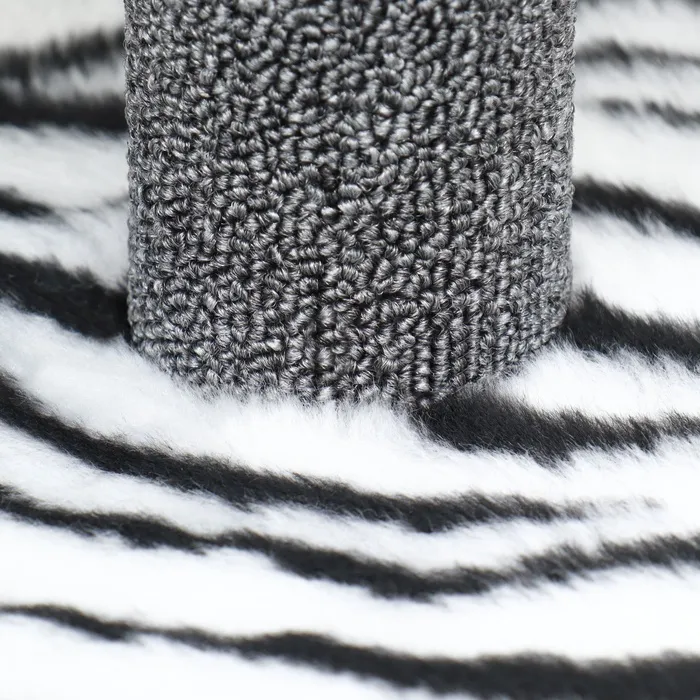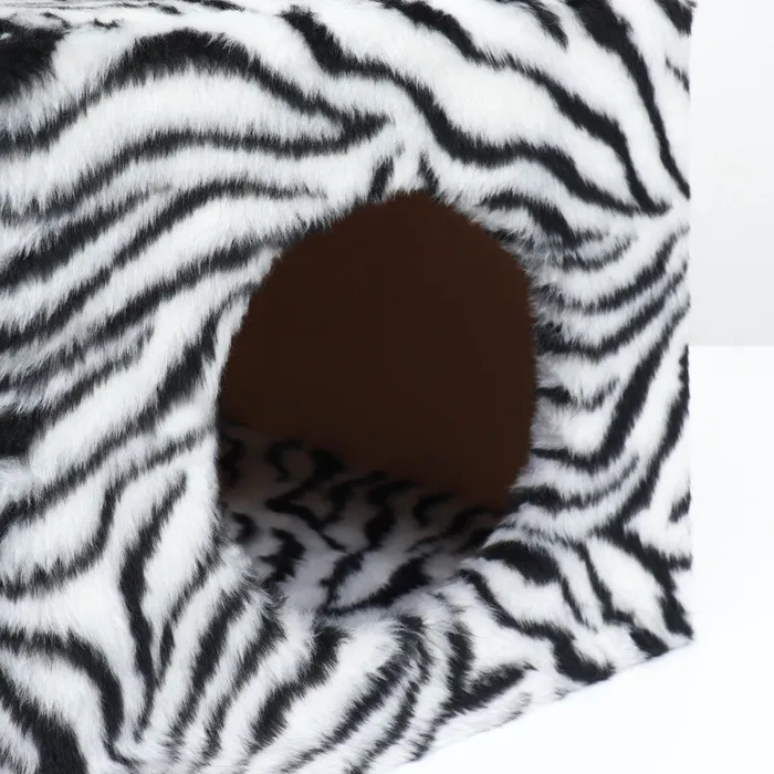 Домик выполнен из прочного материала — ковролина с узором зебра, который не только устойчив к царапинам, но и прекрасно вписывается в любой интерьер. Высота комплекса составляет 75 см, что идеально подходит для кошек любого размера. В нем есть закрытая зона для сна, открытые платформы для наблюдения и игры, а также встроенные когтеточки, которые помогают вашему питомцу поддерживать когти в отличном состоянии.