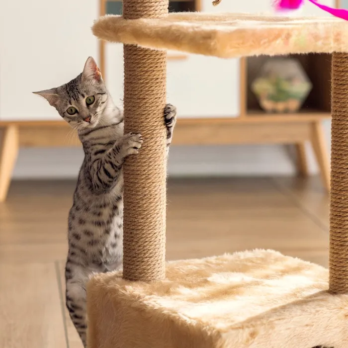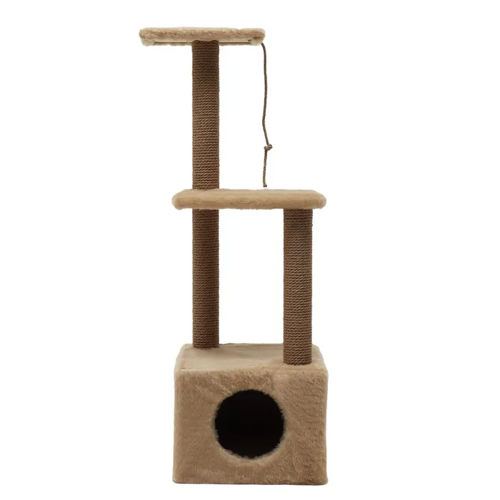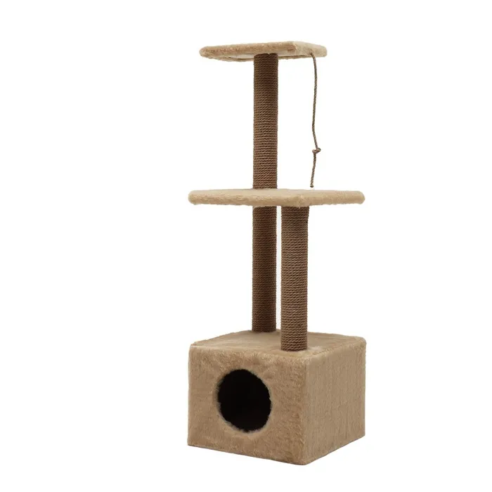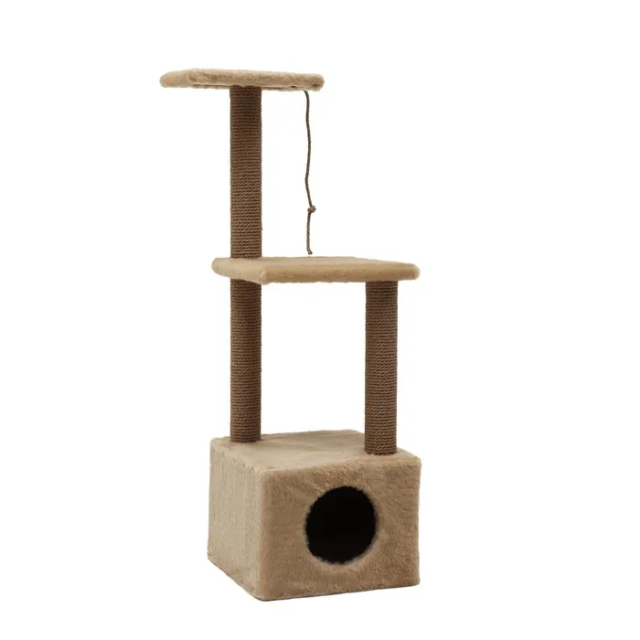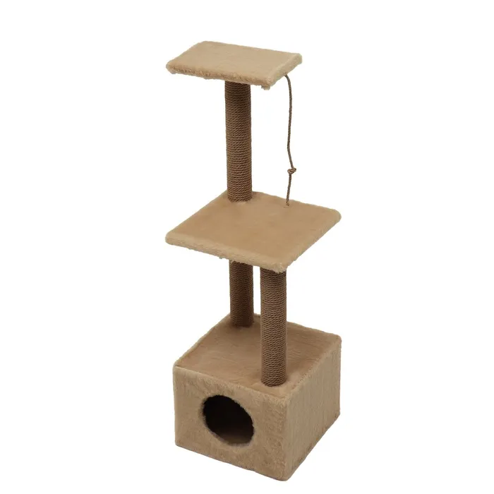 Домик имеет две полки, которые служат как место для отдыха, так и для игр. Ковролин на полках обеспечивает удобную поверхность для кошки, где она может точить когти и играть.