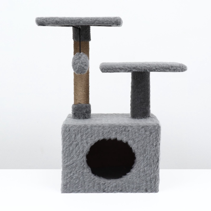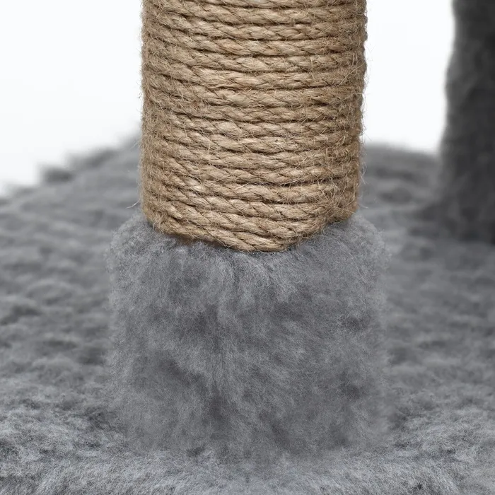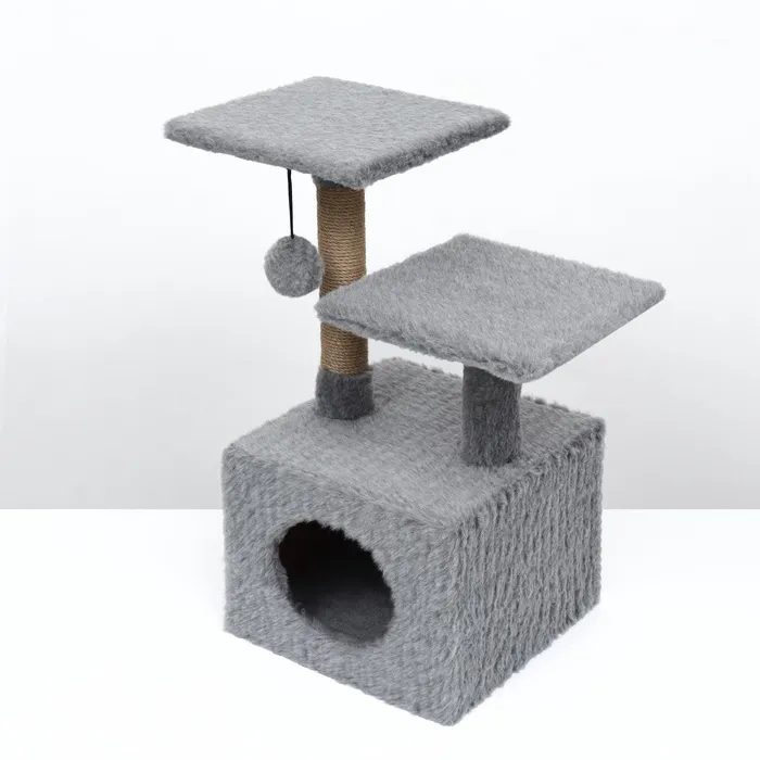 Домик выполнен в стильном сером цвете и включает в себя два уровня: нижний уровень с уютным домиком для сна и уединения, и верхний с двумя просторными полками, где ваша кошка сможет удобно расположиться, наблюдая за происходящим вокруг. Конструкция обтянута искусственным мехом, что добавляет приятные тактильные ощущения и эстетичный внешний вид, а столбики, обмотанные джутом, служат отличной когтеточкой.