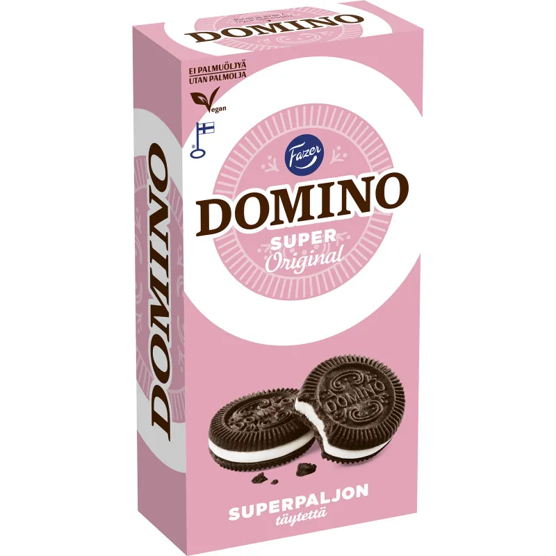 Domino – одно из самых любимых печений в Финляндии, настоящая классика для кофейных столов. Печенье Domino Super Original содержит больше вкусной ванильной начинки, чем обычное печенье Domino. Отличный выбор для праздников или для подачи с кофе. Подходит для веганов.