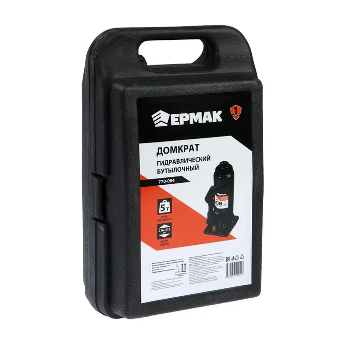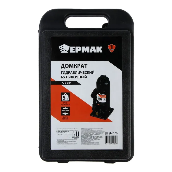 Домкрат гидравлический бутылочный ЕРМАК, 770-084, высота подъема 216-413 мм, 5 т — Характеристики