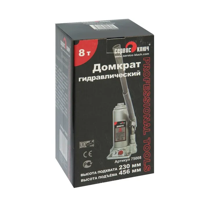 Домкрат гидравлический бутылочный "СЕРВИС КЛЮЧ" 75008, высота 230-456 мм, 8 т — Характеристики