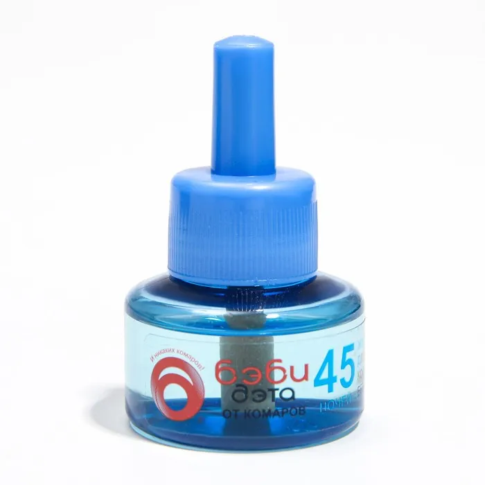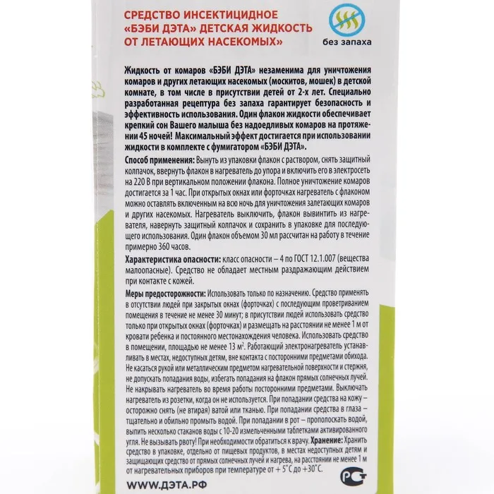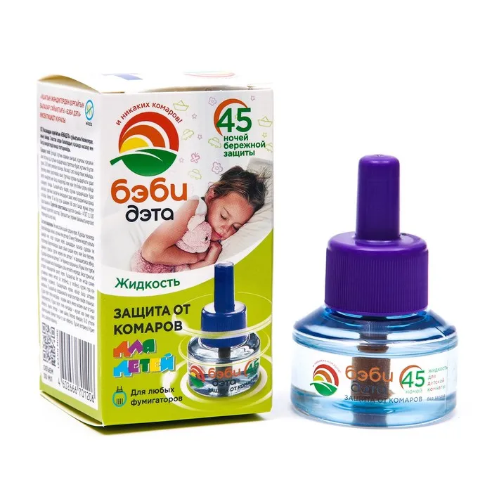Жидкость от комаров и летающих насекомых для фумигатора, детский, ДЭТА БЭБИ незаменима для уничтожения комаров и других летающих насекомых (москитов, мошек, мух) в детской комнате.Специально разработанная рецептура, без запаха, гарантирует безопасность и эффективность использования. Подходит для малышей с двух лет. В составе натуральный пиретрин – экстракт далматской ромашки, природный инсектицид, безопасный для детей и беспощадный в борьбе с комарами.Один флакон жидкости обеспечивает крепкий сон ребёнка без надоедливых комаров на протяжении 45 ночей!Полное уничтожение комаров уже через 1 час после начала работы фумигатора. Жидкость подходит к большинству электрофумигаторов. Максимальный эффект достигается при использовании жидкости в комплекте с фумигатором БЭБИ ДЭТА.Для защиты от комаров и борьбы с другими насекомыми в ассортименте бренда ДЭТА представлена широкая линейка средств: для использования на улице и для домашнего использования; товары подходят для детей и взрослых. Со средствами бренда ДЭТА ваши любимые активности на природе – прогулка и пикник в парке или в лесу, выезд на природу, на дачу, в поход, на рыбалку, охоту, за грибами или на фестиваль пройдут без комаров.Для детской кожи особенно важно использовать безопасные средства от комаров. В ассортименте бренда БЭБИ ДЭТА есть спреи и аэрозоли, которые подходят для малышей и младенцев уже с 9 месяцев. Средства содержат пантенол, алоэ вера, аллантоин, в состав входит также ромашка и другие натуральные компоненты, которые помогают смягчить и увлажнить кожу, предотвращая раздражение от укусов комаров и других насекомых. Также для безопасного детского использования мы разработали браслеты и клипсы от комаров, которые удобно использовать во время прогулок на свежем воздухе.Торговая марка ДЭТА предлагает самые удобные формы средств помощи против насекомых - вредителей: аэрозоль, спрей, крем, молочко, гель, комплект (набор) фумигатор и жидкость или пластины (таблетки), стержни, спирали. Они содержат отпугивающие вещества и эффективно отгоняют комаров, а также других вредителей.Большинство средств содержат активные компоненты – дэта (диэтилтолуамид) или ir3535 - эффективное против насекомых вещество, которое безопасно для использования в соответствии с инструкцией по применению к средству (это справедливо в т.ч. для бытовой химии, косметических средств, репеллентов и инсектицидов).Мы также рекомендуем попробовать средства ДЭТА против клещей (в т.ч. иксодовых клешей), мошек, мокрецов, слепней, москитов, ос, клопов, блох, мух, тараканов и других летающих насекомых. Продукты ДЭТА защитят ваш дом от назойливых насекомых, обеспечат приятную и беззаботную прогулку на свежем воздухе и отдых на даче для всей семьи. Состав:натуральные пиретрины (0,025%), трансфлутрин (0,1%), праллетрин (0,5%); растворитель.