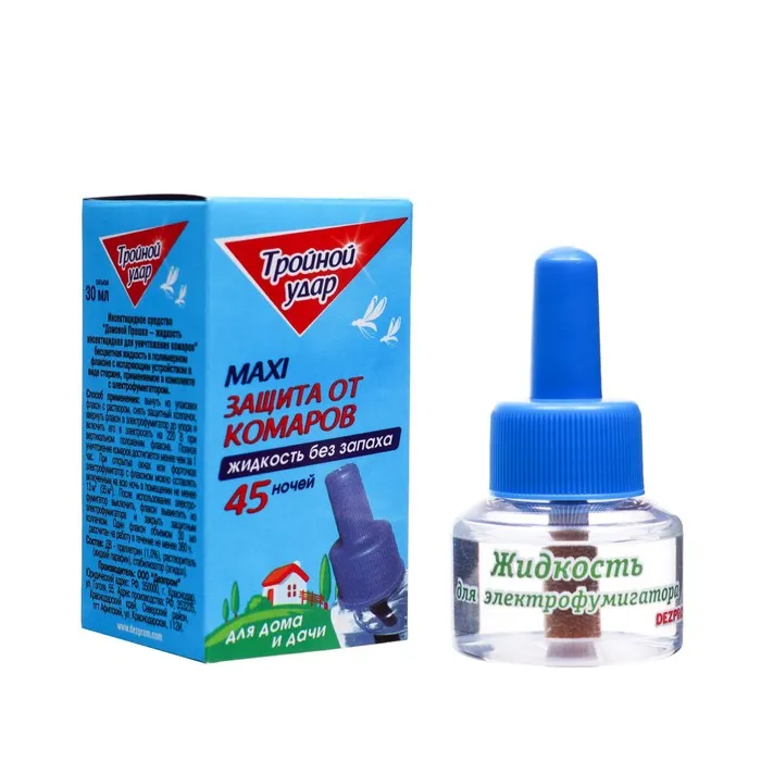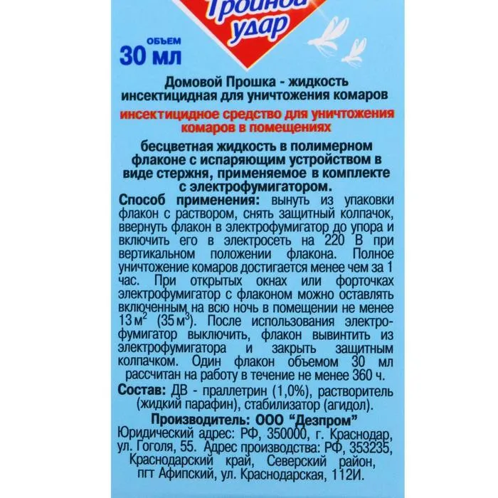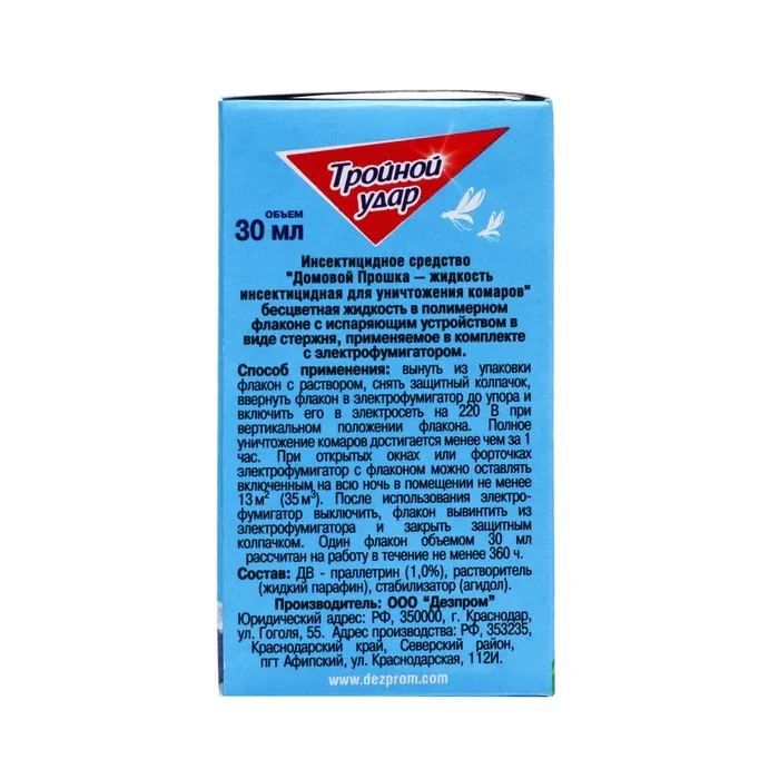 Дополнительный флакон-жидкость от комаров «Домовой Прошка», Тройной Удар, 45 ночей, 30 мл — Характеристики
