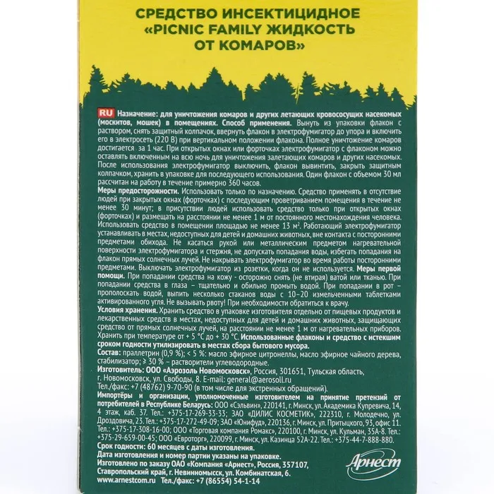 Дополнительный флакон-жидкость от комаров Picnic Family, с растительными экстрактами, 45 ночей, 30 мл — Характеристики