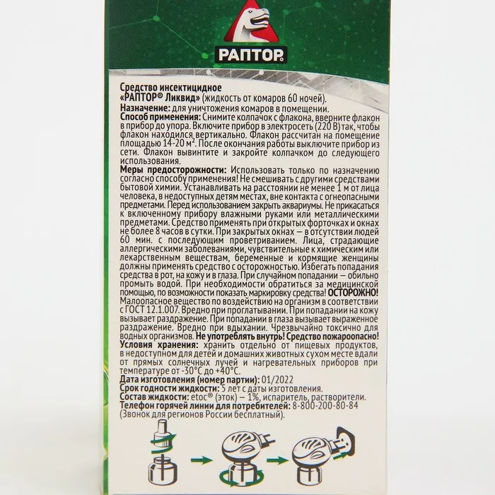 Дополнительный флакон-жидкость от комаров "Раптор", без запаха, 60 ночей — Характеристики