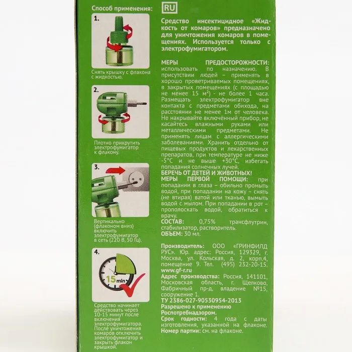 Жидкостный наполнитель 30 ночей. Жидкостный наполнитель для фумигатора - универсальное и удобное в использовании средство для борьбы с комарами. В помещении общим объемом около 60 кубических метров средство начинает работать уже через 15 минут. Для полного уничтожения комаров требуется приблизительно не более 1 часа. Средство выпускается в стандартном флаконе и подойдет для 99% приборов, предлагаемых на Российском рынке.
