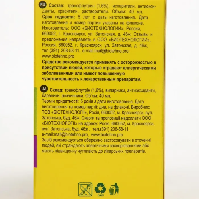 Состав: трансфлутрин (1,6%), испарители, антиоксиданты, красители, растворители.