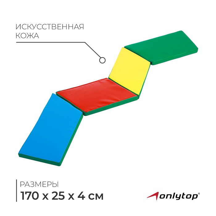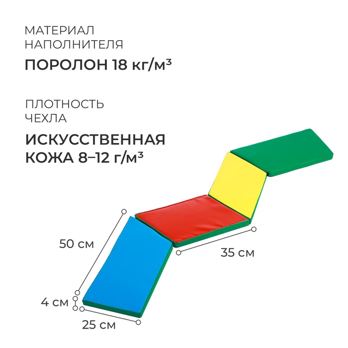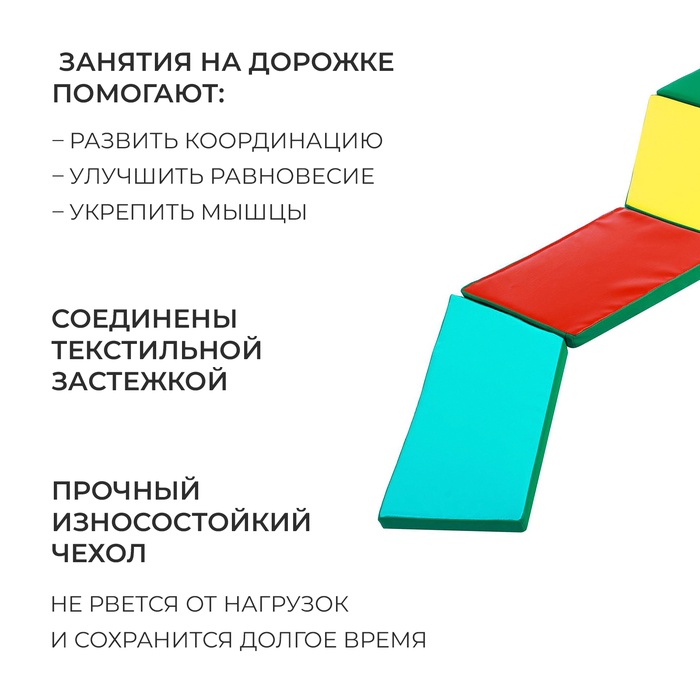 Изделие состоит из четырёх мягких элементов. Они скреплены между собой текстильной застёжкой на липучке. Дорожка имеет съёмные чехлы на молнии.