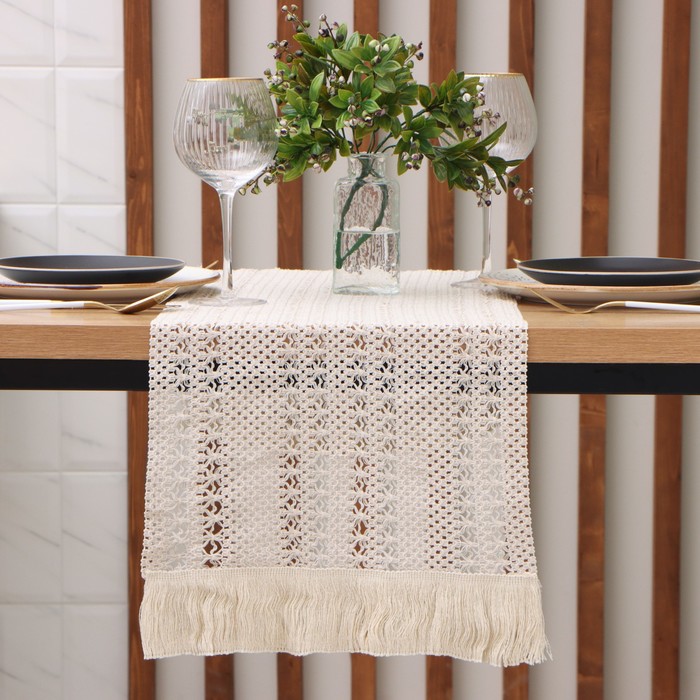 Эта ажурная скатерть-дорожка из полиэстера станет универсальным решением для сервировки обеденного стола. Её изящный бежевый узор и классическая прямоугольная форма создают уютную атмосферу для ежедневных обедов, семейных ужинов или праздничных застолий. Деликатная бахрома по краям добавляет завершённый, элегантный вид.
