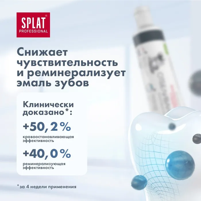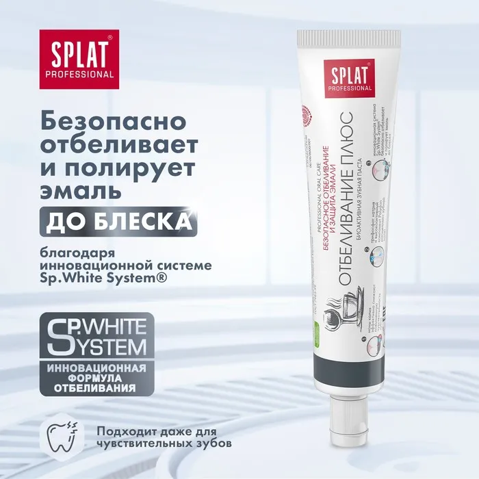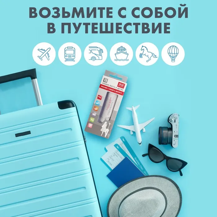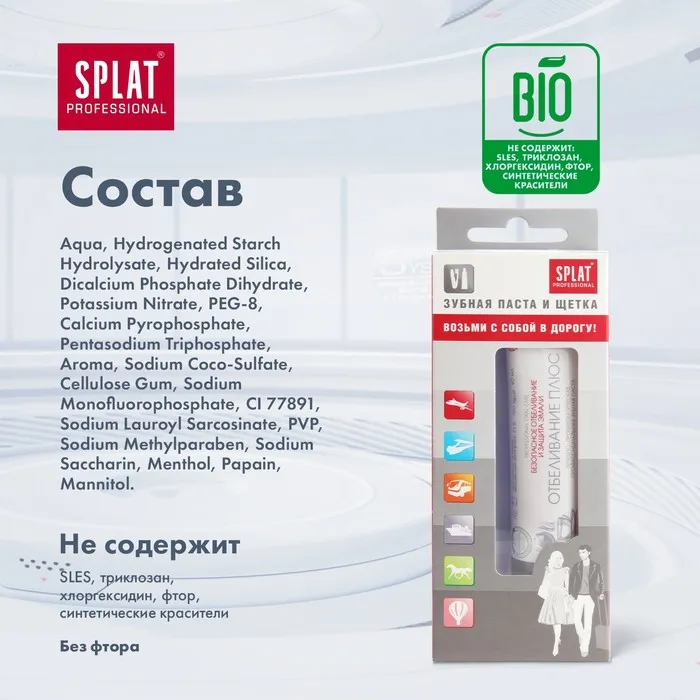В дорожный набор SPLAT входят: мини-упаковка (40 мл) самых популярных продуктов в линейке серии SPLAT PROFESSIONAL — биокальций, ультракомплекс, отбеливание плюс, и складная зубная щетка.