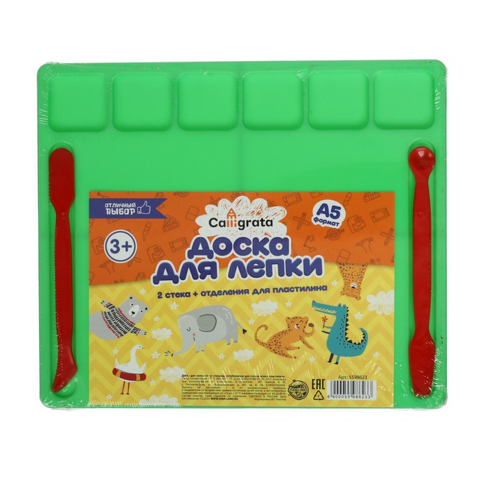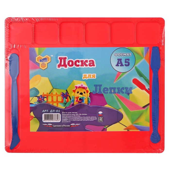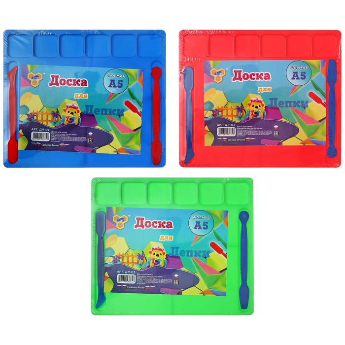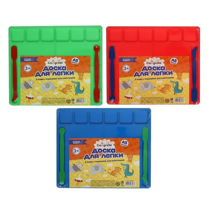 Набор состоит из 3 предметов: 2 стеков и доски. Имеет удобную, функциональную форму с углублениями для стеков и 6 отделениями для пластилина. Производится из жесткого прочного пластика толщиной 2 мм, к которому не липнет пластилин. Гладкая фактура материала устойчива к царапинам. Размер - 170х200 мм (формат А5). Поставляется в нескольких вариантах цвета без возможности выбора.