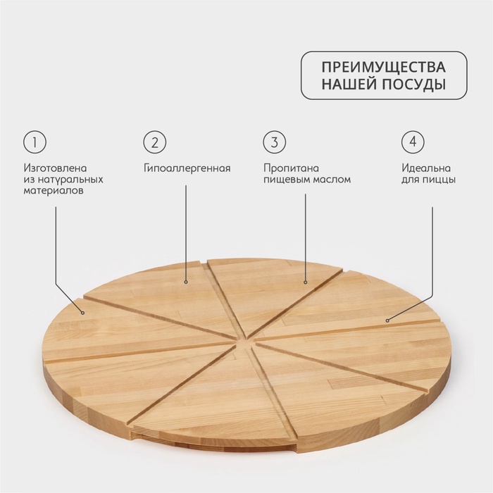 Доска для подачи пиццы деревянная Adelica «Итальяно», с потайными ручками, 8 кусков, d=40 см, толщина 1.8 см, берёза — Характеристики