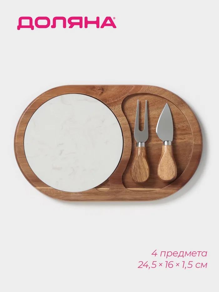 Доска выполнена из прочного бамбука, что придает ей натуральный и стильный внешний вид. В комплекте также идет нож из нержавеющей стали, который обеспечивает легкость и эффективность нарезки.