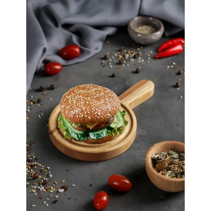 • Форма: Доска имеет круглую форму, что делает ее удобной для подачи пиццы и других блюд.