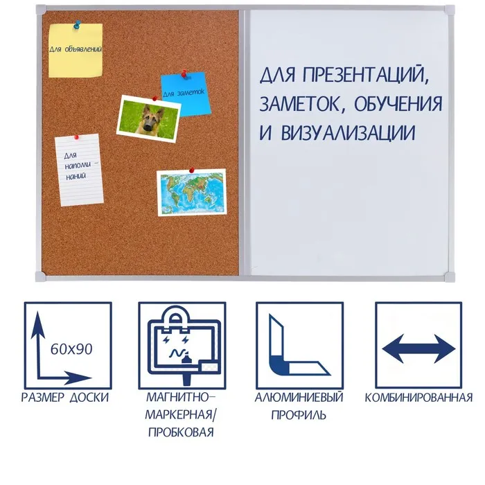 Комбинированная доска серии СТАНДАРТ - магнитно-маркерная и пробковая доски на единой рабочей поверхности - позволит разместить объявления при помощи кнопок и офисных булавок. Широко используется в организациях различного рода деятельности.