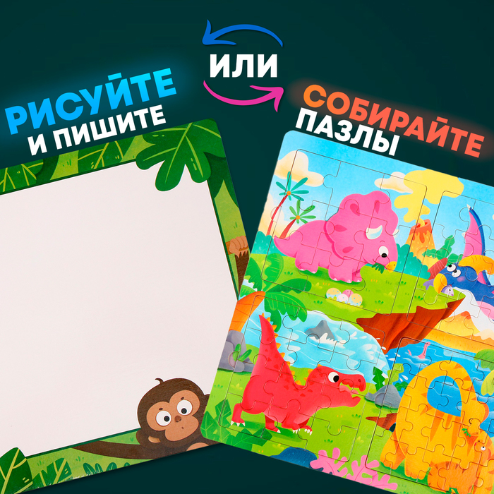 Доска магнитно-маркерная — увлекательное развлечение для юных художников. Такое приобретение раскроет творческий потенциал ребёнка и разовьёт фантазию. В комплект входят яркие и красочные пазлы, которые окунут малыша в мир динозавров и прокачают мелкую моторику.