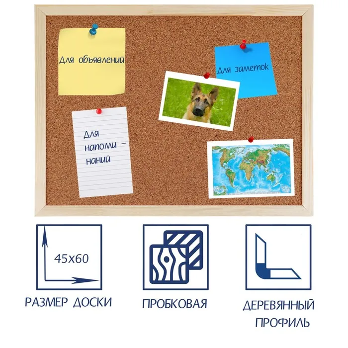 Информация крепится к доске при помощи булавок или силовых кнопок. Есть возможность горизонтального и вертикального расположения на стене.