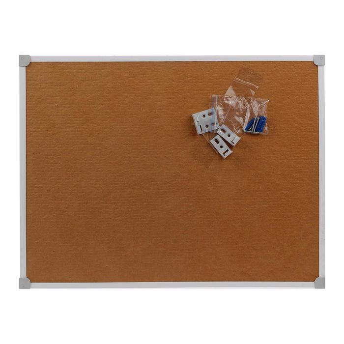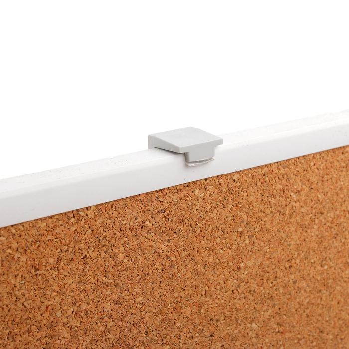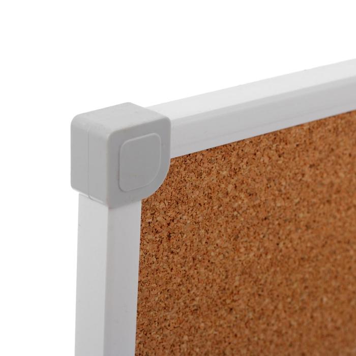 Основа доски - ДВП.Рабочая поверхность покрыта натуральным пробковым слоем толщиной 1 мм.Доска обрамлена ПВХ профилем белого цвета и имеет пластиковые уголки серого цвета.