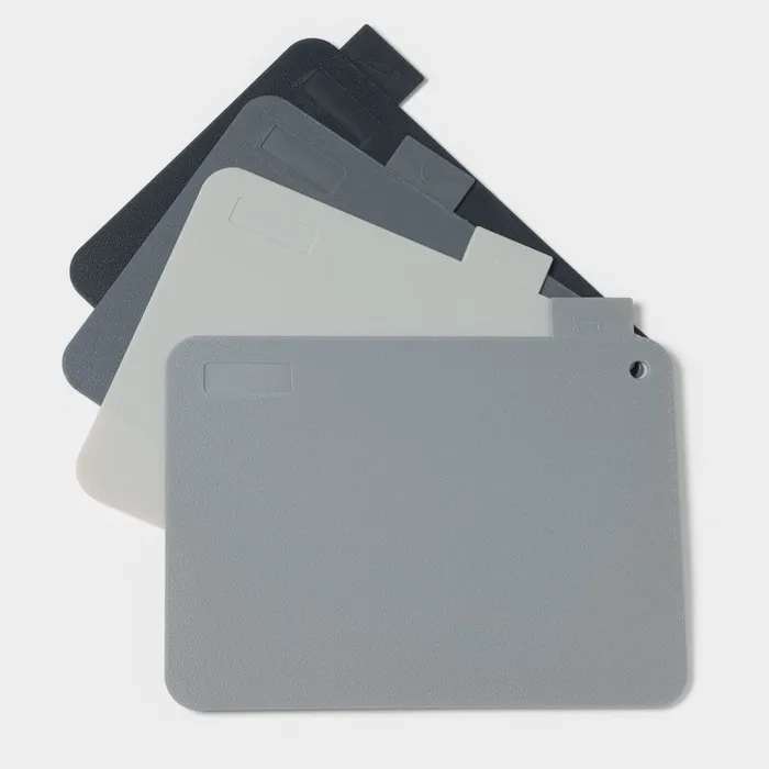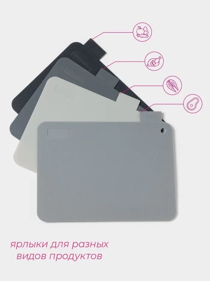 - Четыре доски в комплекте: набор включает в себя четыре разделочные доски, каждая из которых предназначена для различных видов продуктов, что предотвращает смешение запахов и бактерий.