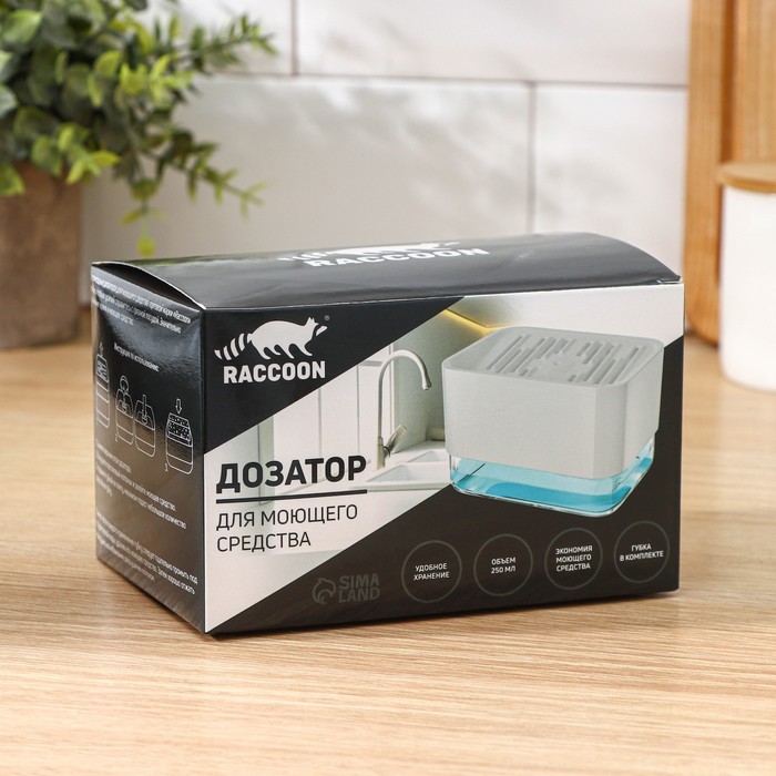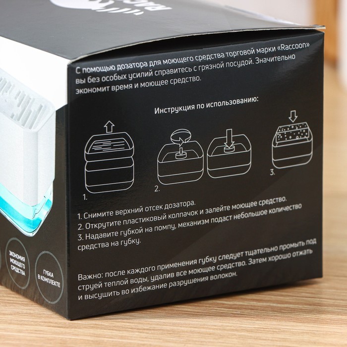 С помощью дозатора для моющего средства торговой марки Racoon вы без труда справитесь с грязной посудой.