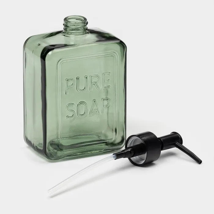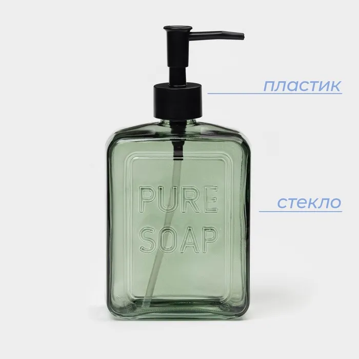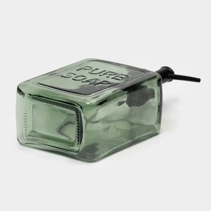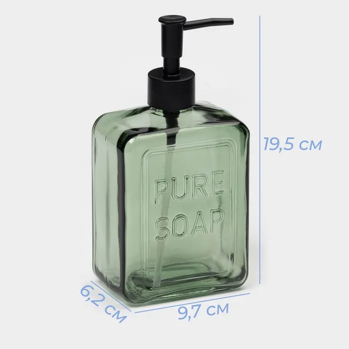 - Стильный дизайн: прозрачный зелёный цвет и минималистские надписи делают дозатор привлекательным элементом интерьера.