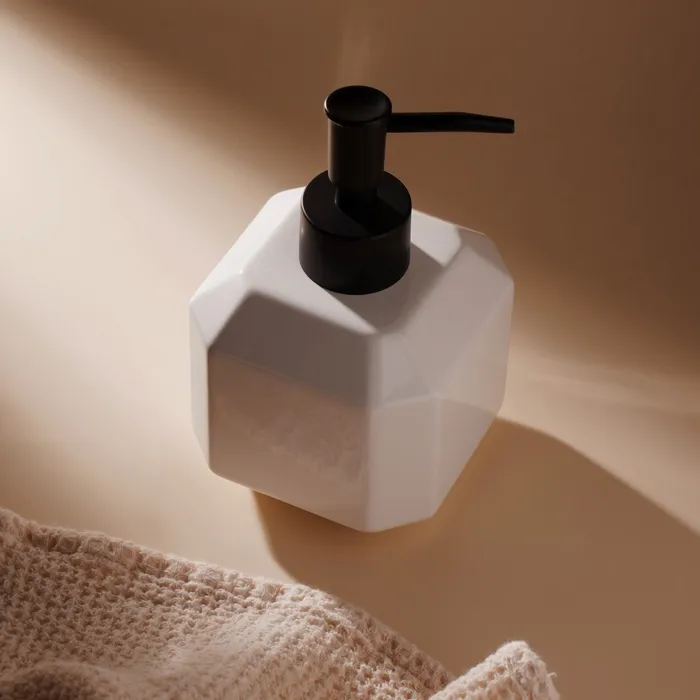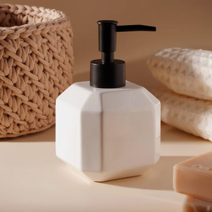 Изготавливаемый из качественной керамики, данный дозатор сочетает в себе прочность и изящество. Его квадратная форма и минималистичный дизайн позволяют идеально вписаться в любую ванную комнату или кухню, создавая атмосферу уюта и стиля. Объёмом 380 мл, он подходит для повседневного использования и не требует частой заправки.