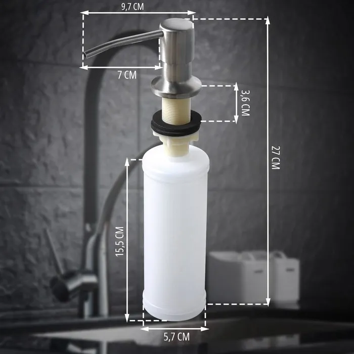 Встраиваемый дозатор для жидкого мыла прекрасно впишется в интерьер вашей кухни или ванной комнаты, при этом создав визуального шума. Диспенсер встраивается в поверхность мойки или столешницы, благодаря чему не занимает много места. Подходит для столешницы толщиной 3,5 см.