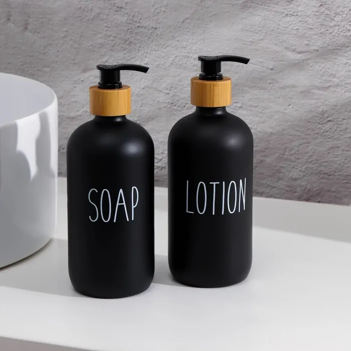 Черные стеклянные бутылочки с ручным механизмом управления не только привлекательно выглядят, но и обеспечивают удобство в использовании благодаря наливному способу заправки. Каждый дозатор вмещает 500 мл жидкого мыла, что избавит вас от частых заправок и сделает ваше пространство более организованным.