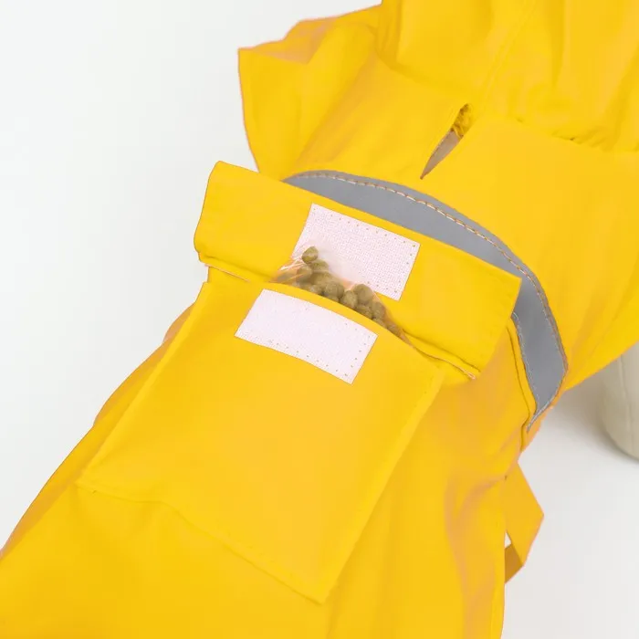 Отверстие в дождевике на спинке для быстрого пристегивания поводка, а кармашек поможет вашему питомцу всегда иметь при себе любимое лакомство!