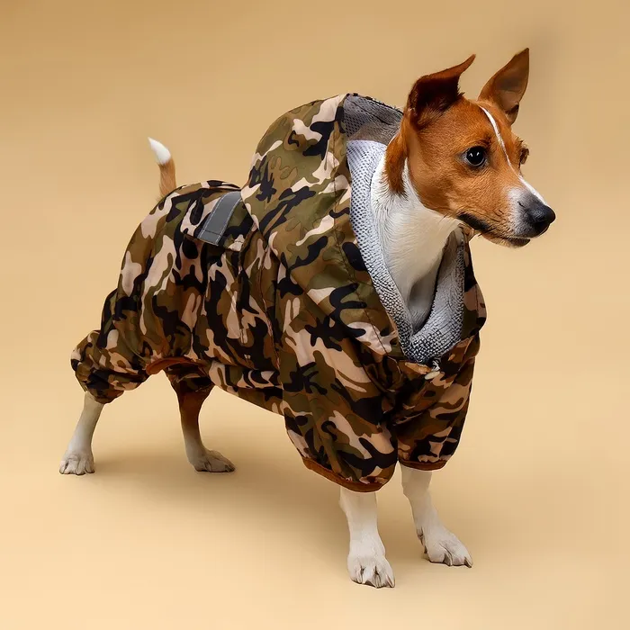 Непромокаемая прочная ткань. Большой капюшон с прозрачным экраном защитит собаку от сильного ветра и дождя. Легко одевается, застегивается на кнопки на животе, пах открыт.