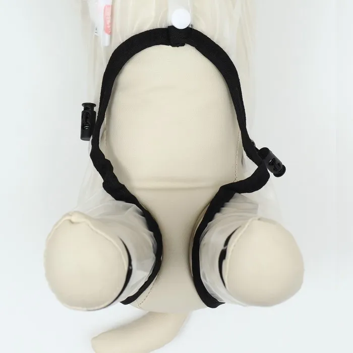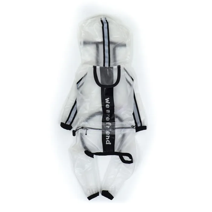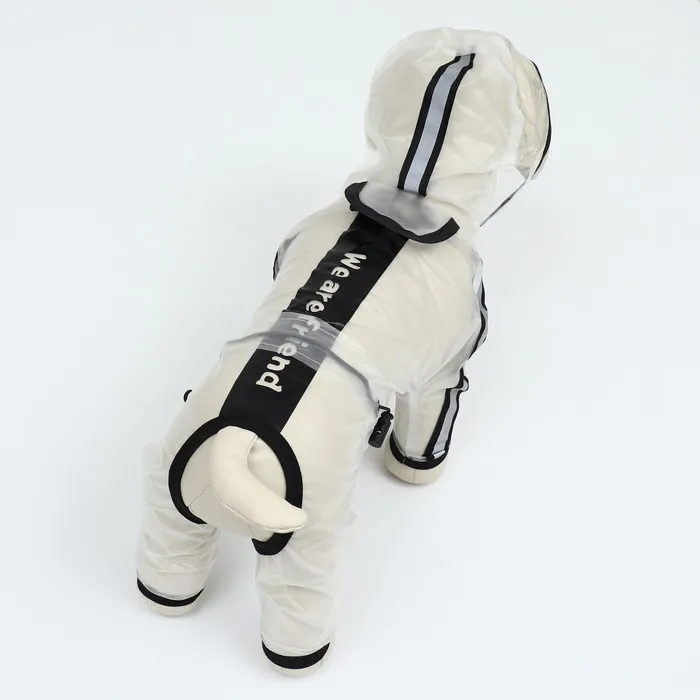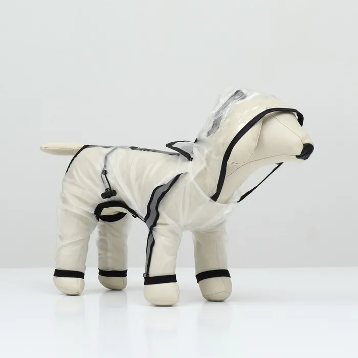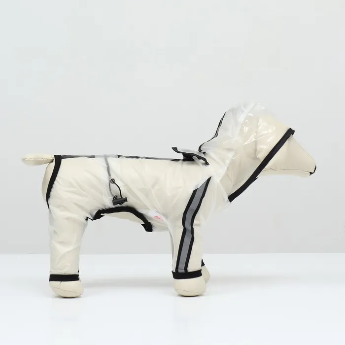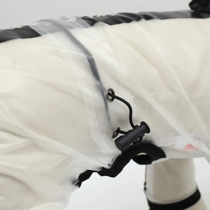 Непромокаемая прочная ткань. Большой капюшон с прозрачным экраном защитит собаку от сильного ветра и дождя. Легко одевается, застегивается на кнопки на животе, пах открыт.