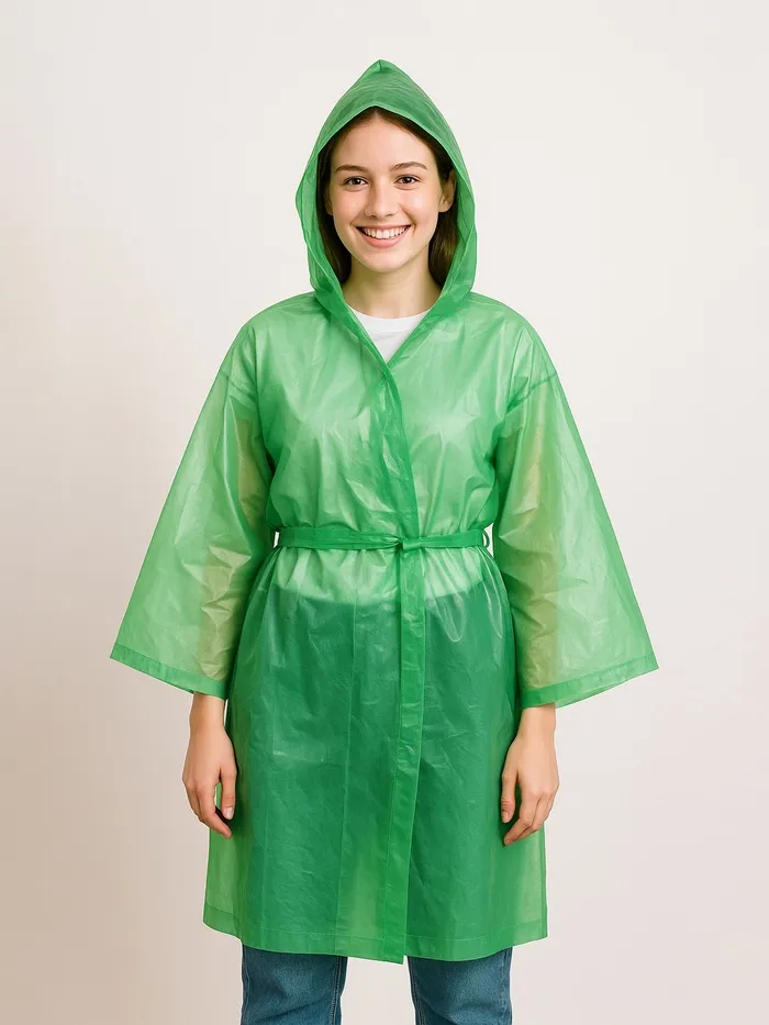Многоразовый плащ-дождевик сделан из прочного и эластичного материала – ПВХ, при механическом воздействии материал в первую очередь тянется, поэтому он не порвётся при первой носке. При небольшой толщине и весе, дождевик надёжно защищает от влаги и ветра.