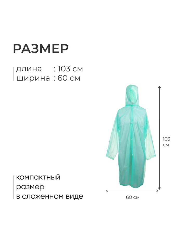 Дождевик защищает одежду от влаги, спасает от косых ливней. Освобождает руки - не нужно брать с собой зонтик. В сложенном состоянии дождевик занимает мало места, легко помещается в рюкзаке или сумке. Застёгивается на кнопки.