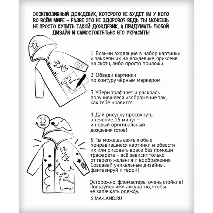 Возьми входящие в набор картинки и закрепи их на дождевике.Обведи картинки по контуру чёрным маркером.Убери трафарет и раскрась получившееся изображение так, как тебе нравится.Дай рисунку подсохнуть в течение 15 минут - и новый оригинальный дождевик готов!Ты можешь взять любые понравившиеся картинки или рисовать вовсе без помощи трафарета - всё зависит только от твоего желания и воображения!Особенности дождевика