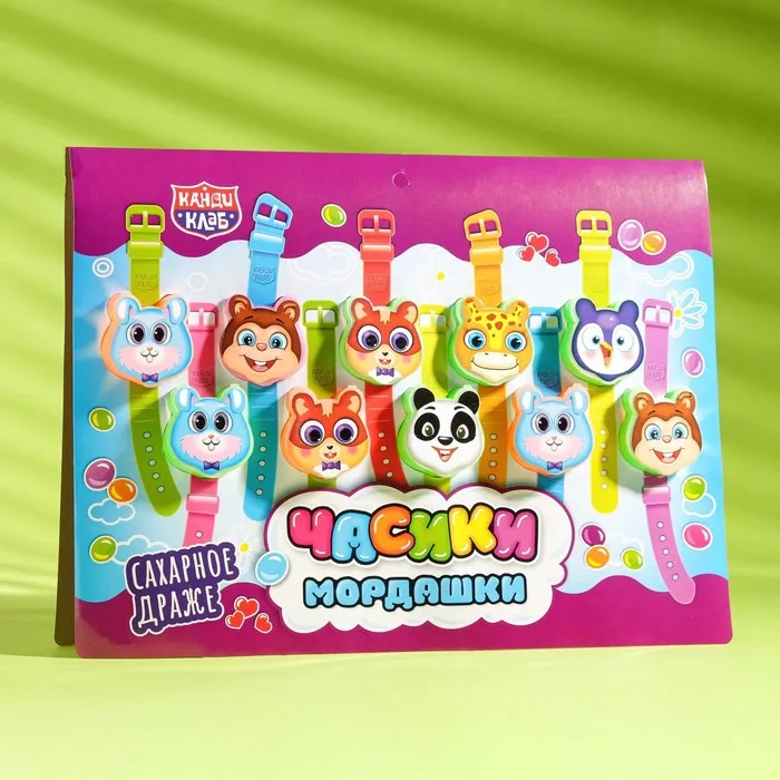 Оригинальная детская сладость Канди Клаб Часики-Мордашки в виде детских часов с забавными мордашками животных со сладкими конфетками драже с клубничным вкусом внутри - прекрасный подарок детям, который можно взять с собой на прогулку, в поездку, в детский сад или школу. В упаковке находится сразу 20 часиков по 3 гр. Используйте необычную сладость для украшения стола или развлечения детей на вечеринке, дне рождении или любом другом празднике. Не содержит ГМО, жиров, трансжиров, консервантов в составе. Можно давать детям от трех лет. Оригинальный детский десерт Канди Клаб исключает наличие в составе некачественных компонентов.