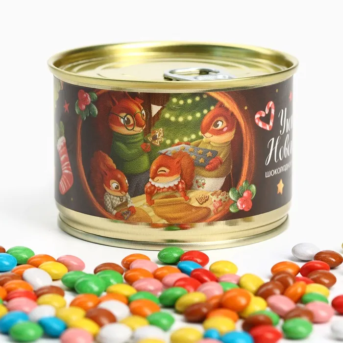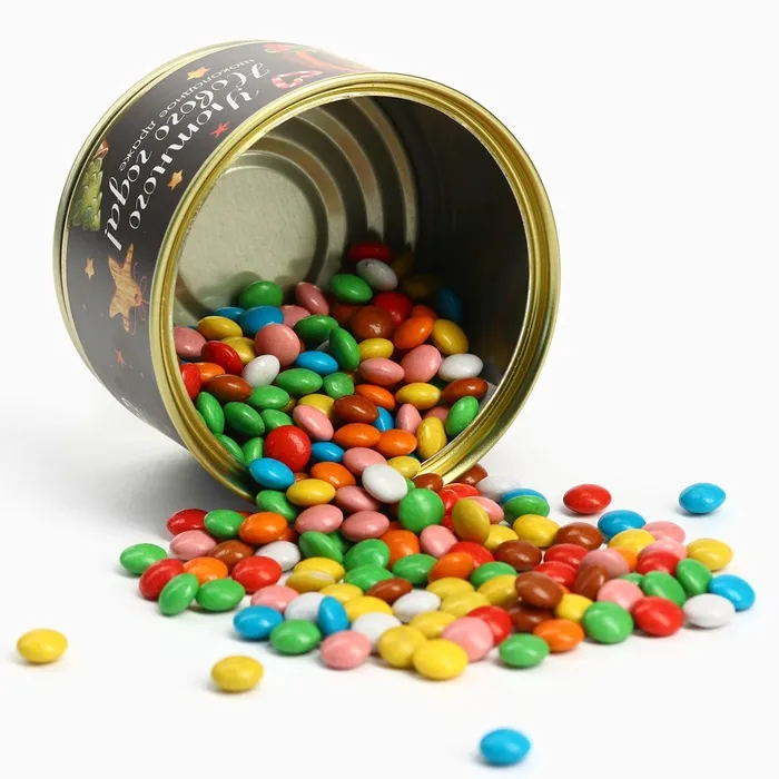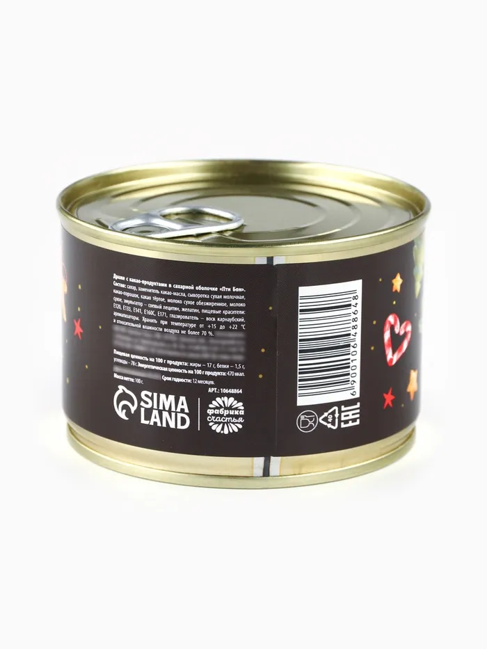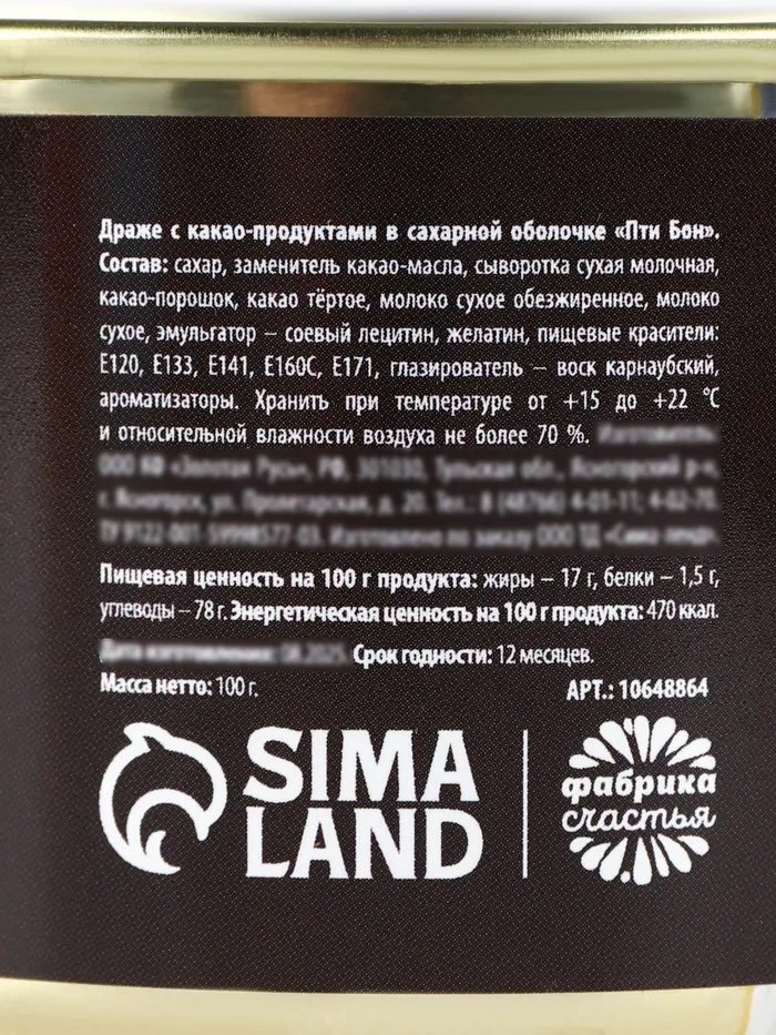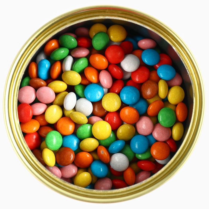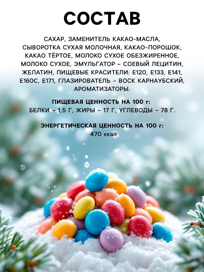 Состав: сахар, заменитель какао-масла, сыворотка сухая молочная, какао-порошок, какао тёртое, молоко сухое обезжиренное, молоко сухое, эмульгатор – соевый лецитин, желатин, пищевые красители: Е120, Е133, Е141, Е160С, Е171, глазирователь – воск карнаубский, ароматизаторы.