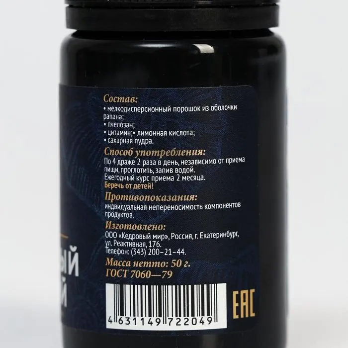 Состав: мелкодисперсионный порошок из оболочки рапана, пчелозан, цитамин, лимонная кислота, сахарная пудра.