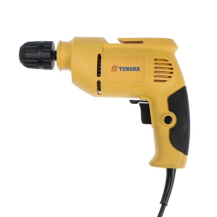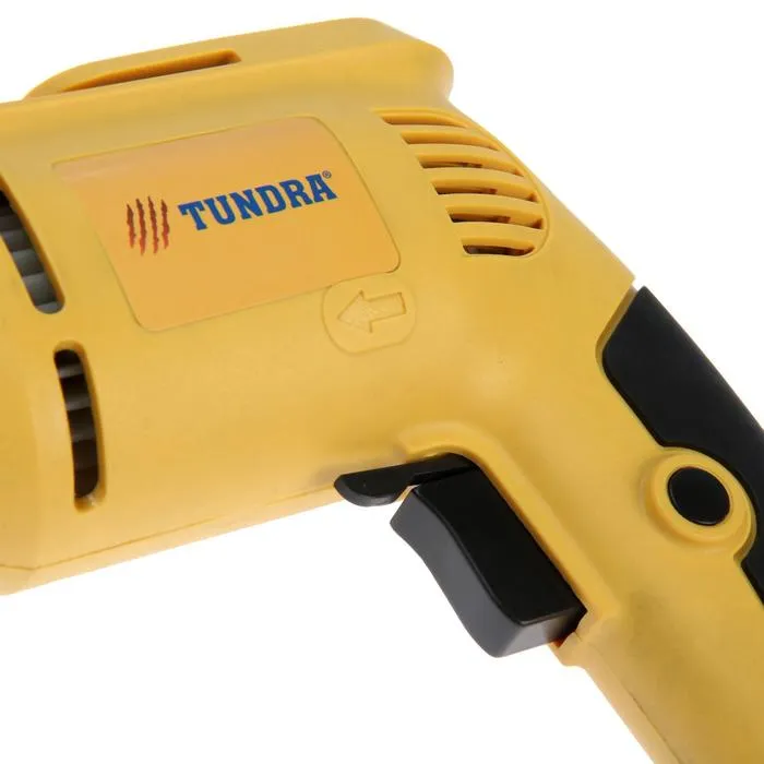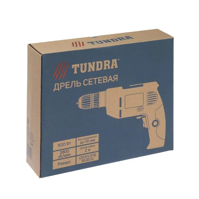 Дрель ТУНДРА станет надёжным помощником при строительстве или ремонте. Компактный инструмент весом менее 2 кг оснащён электродвигателем с угольными щётками мощностью 500 Вт, развивающим скорость до 2800 об/мин. Подключается к бытовой электрической сети кабелем длиной 2 м.