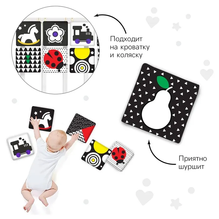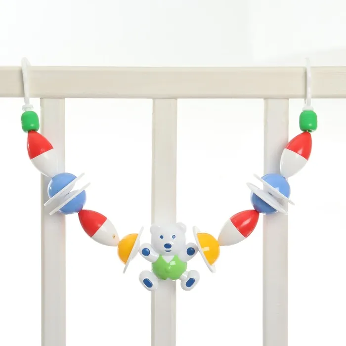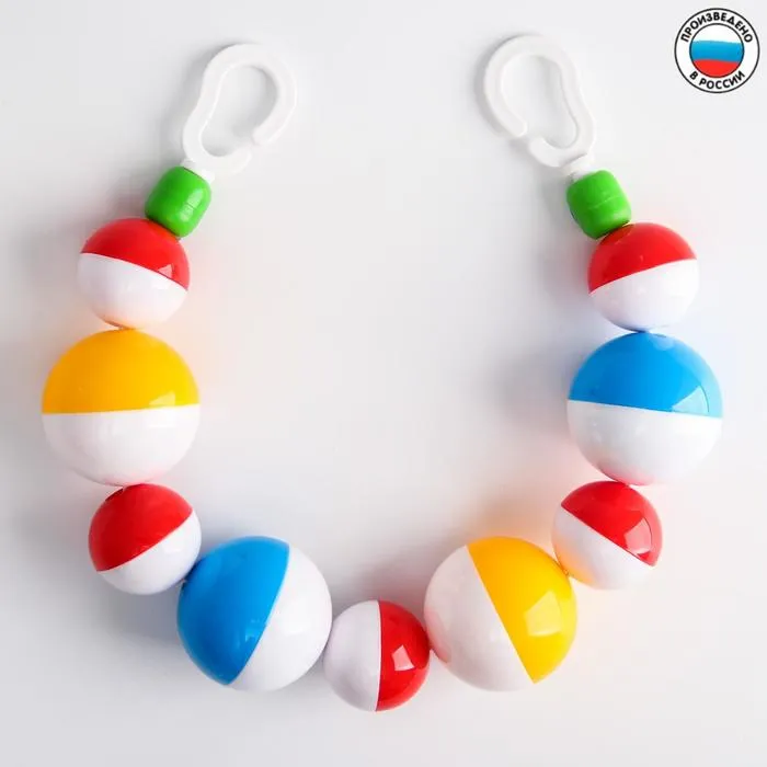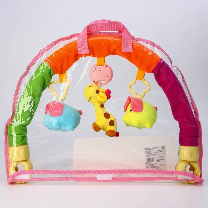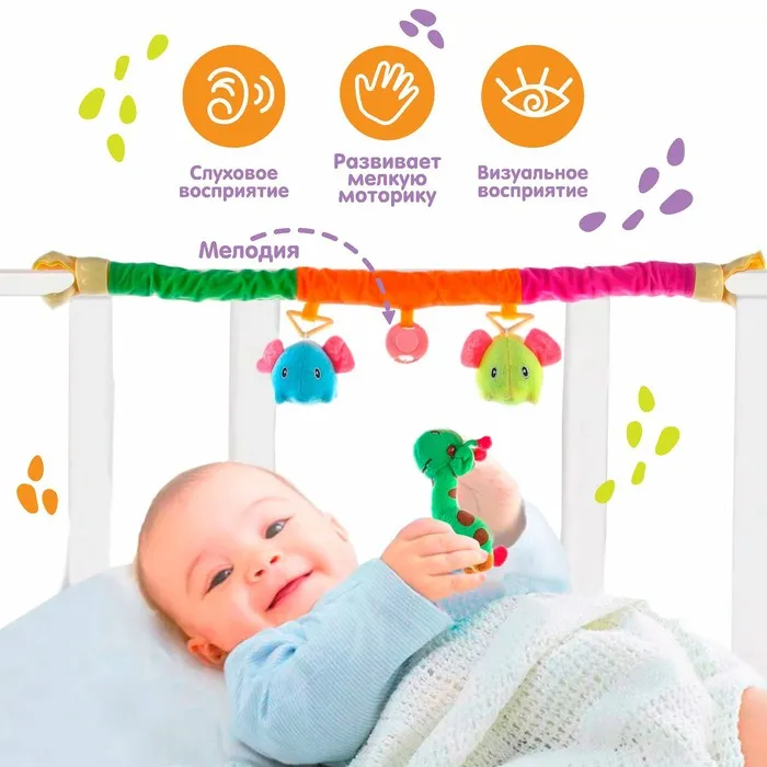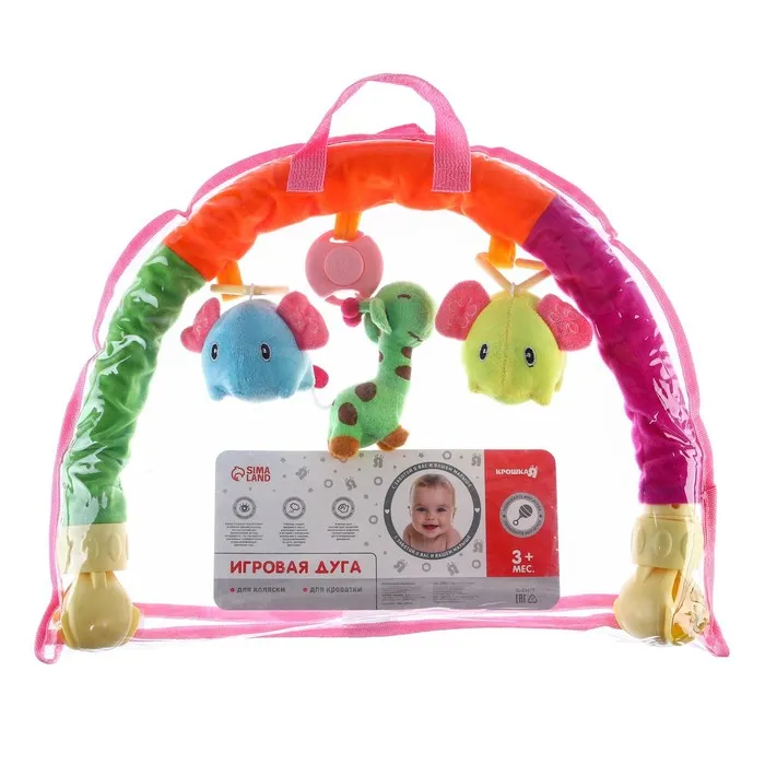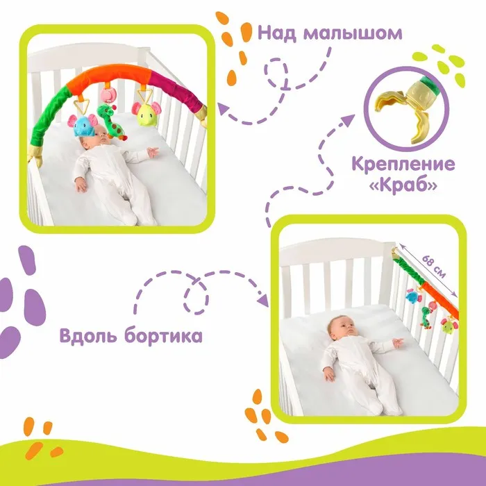 Эту дугу можно закрепить на детской кроватке, коляске или автокресле с помощью удобных прищепок. Угол наклона дуги регулируется. Сначала малыш будет просто рассматривать яркие игрушки, лежа на спинке, но со временем он обязательно начнет тянуться к ним ручками и ножками, совершенствуя свои двигательные навыки. Игрушки на дуге имеют различные цвета и формы, в том числе материал — специально для развития тактильных ощущений малышей. Изделие изготовлено из текстильных материалов с элементами пластмассы.