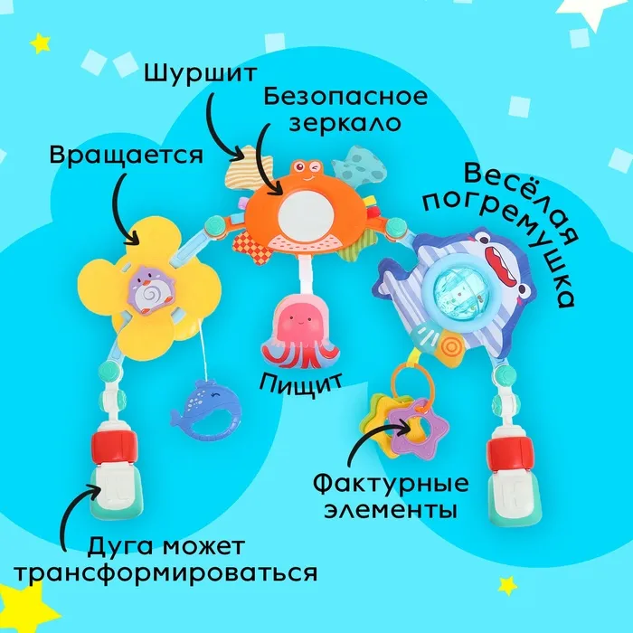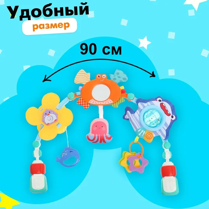 Яркая и развивающая дуга «Подводный мир» — это настоящее морское приключений для вашего малыша! Она станет отличным компаньоном в кроватке или коляске. Дуга длиной 90 см легко крепится к любым поверхностям и оснащена множеством интересных элементов для игры.