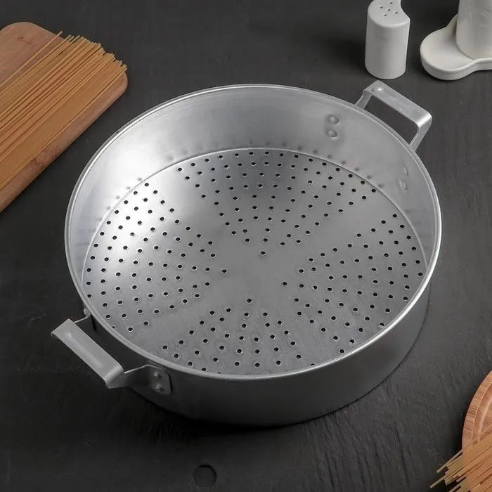 Дуршлаг изготовлен из качественного штампованного алюминия и имеет удобные ручки. Такой посудой легко пользоваться и её легко мыть.