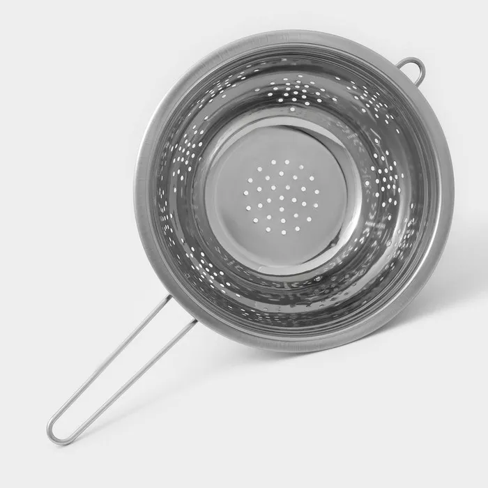 Дуршлаг изготовлен из качественной нержавеющей стали, имеет удобные ручки разной длины. Такую посуду удобно использовать и легко мыть.