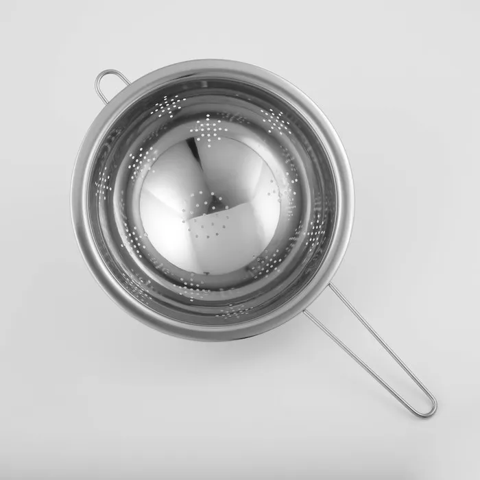 Дуршлаг изготовлен из качественной нержавеющей стали и имеет удобную ручку. Такой посудой легко пользоваться и легко мыть.