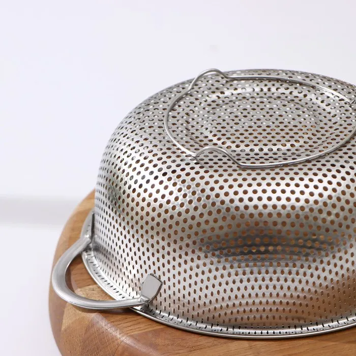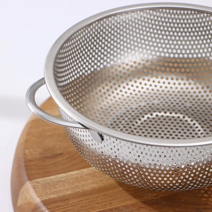 Дуршлаг «Марко» из нержавеющей стали — это стильный и функциональный аксессуар для вашей кухни. Его диаметр составляет 19 сантиметров, а две удобные хромированные ручки обеспечивают комфорт во время использования. Благодаря высококачественной нержавеющей стали этот дуршлаг легко моется и устойчив к коррозии. Он идеально подходит для промывания овощей, фруктов и других продуктов, а также для слива макарон и круп.