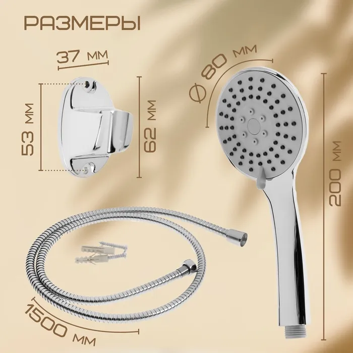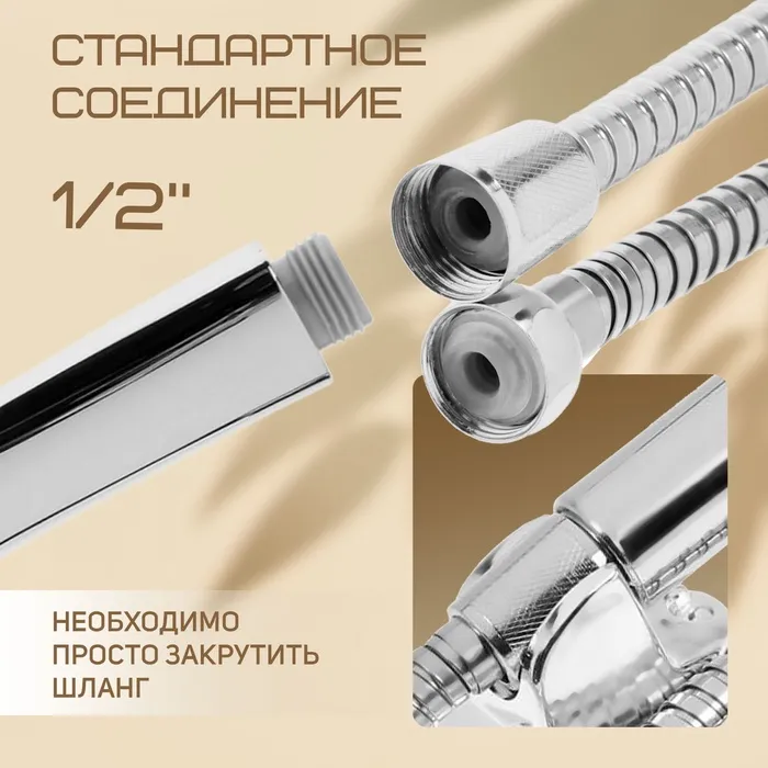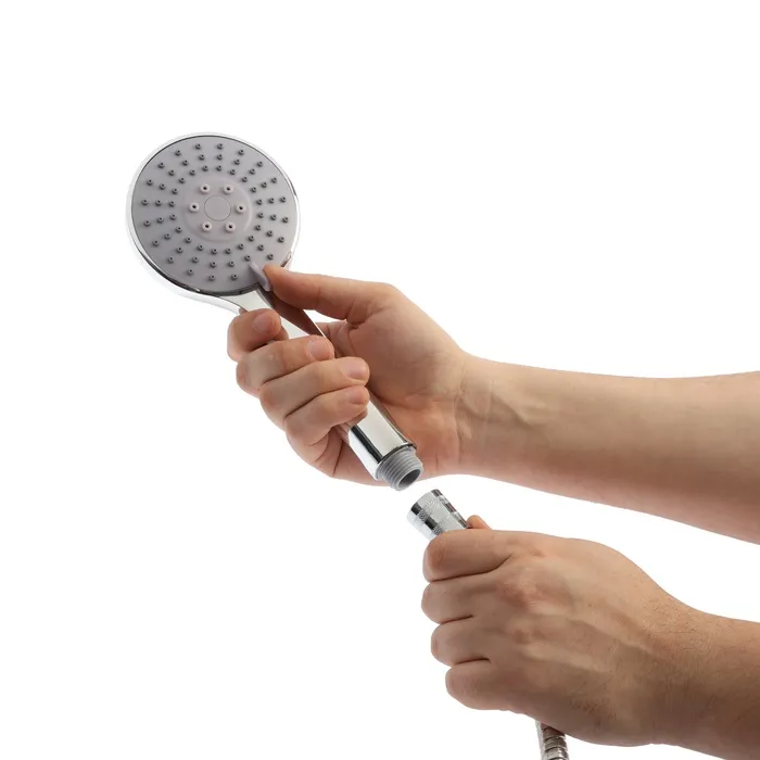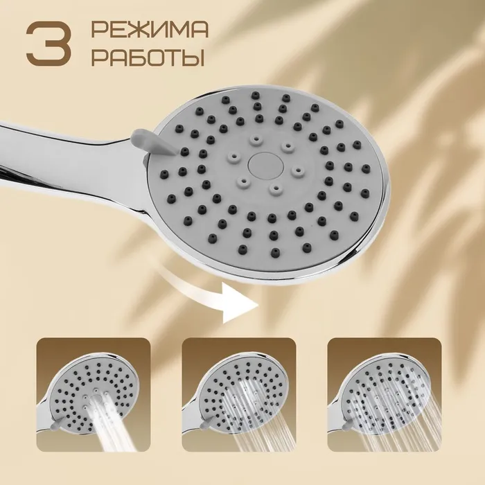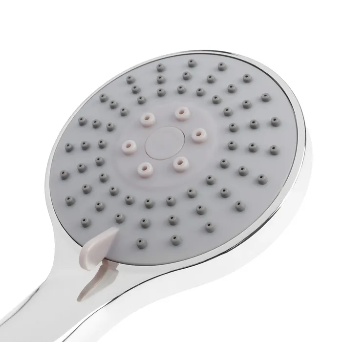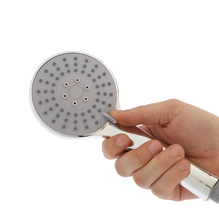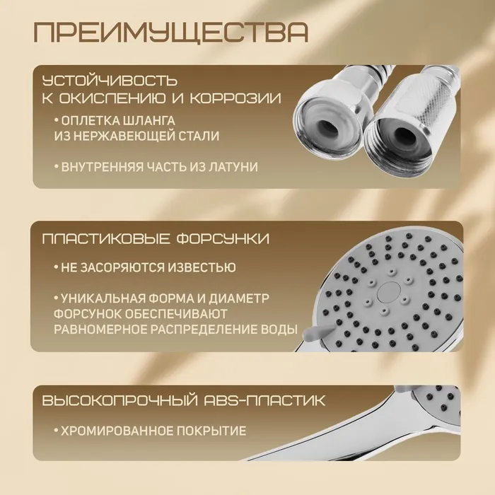 Лейка имеет круглую форму и выполнена из ABS-пластика. Встроенный в душевую лейку переключатель потока воды дает возможность изменять мощность струи и оптимизировать расход воды. Настенный кронштейн для лейки — неповоротный. Шланг изготовлен из нержавеющей стали.