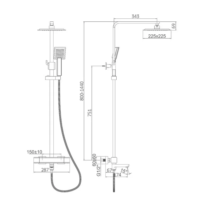 Душевая система ZEIN ZS-65BL, смеситель, троп. и ручная лейка квадрат, нерж. сталь, черный