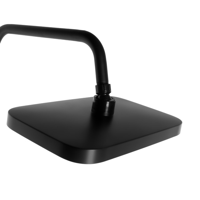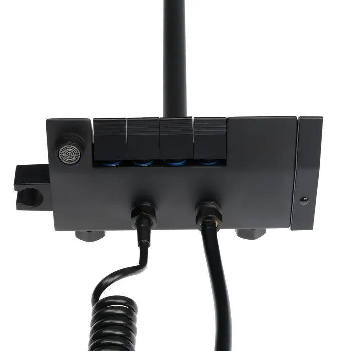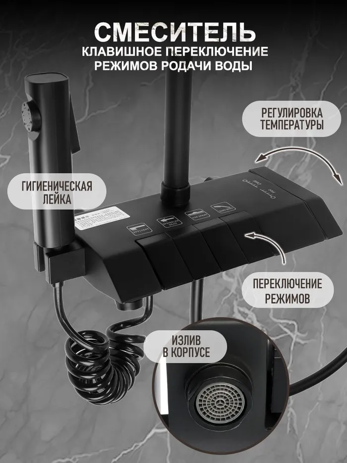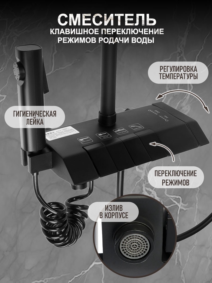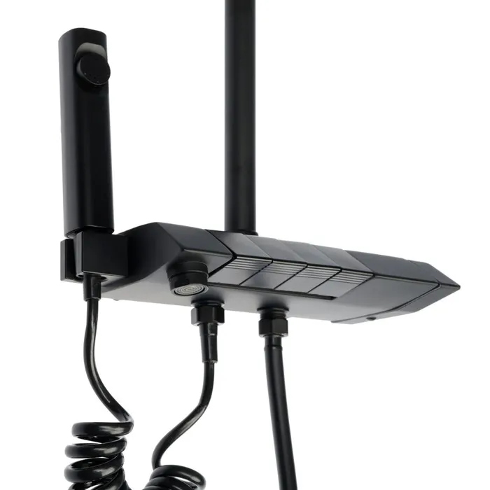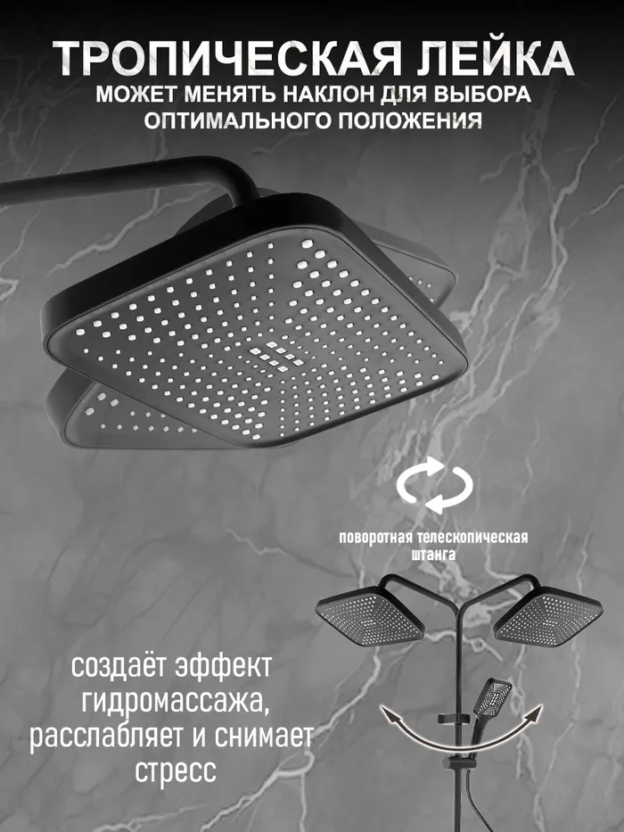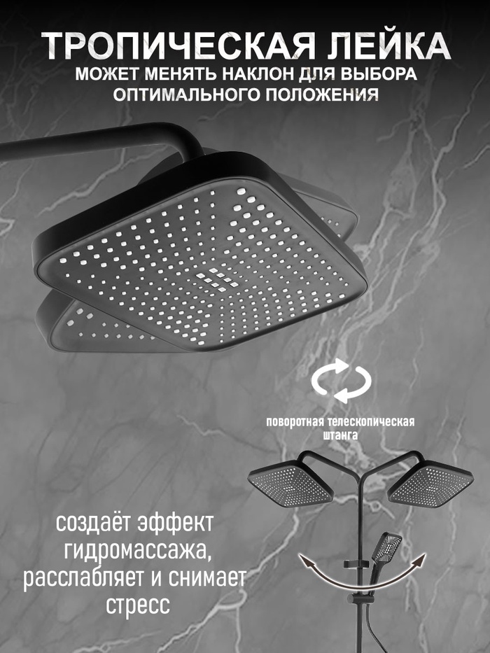 Конструкция фиксируется на стене. Модель оснащена смесителем с изливом, встроенным в корпус. На штанге расположен держатель для лейки со шлангом. Сверху находится тропическая лейка.