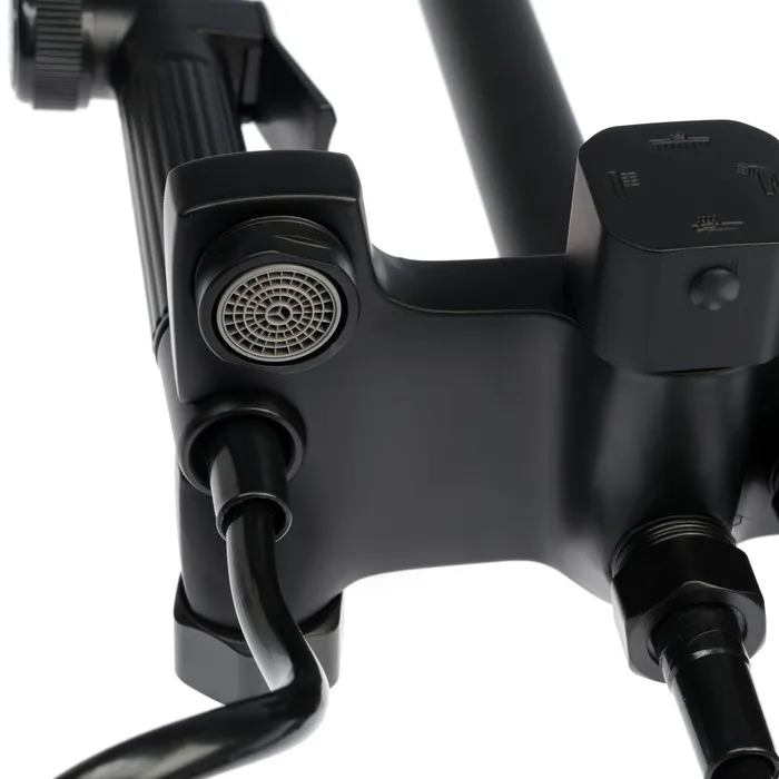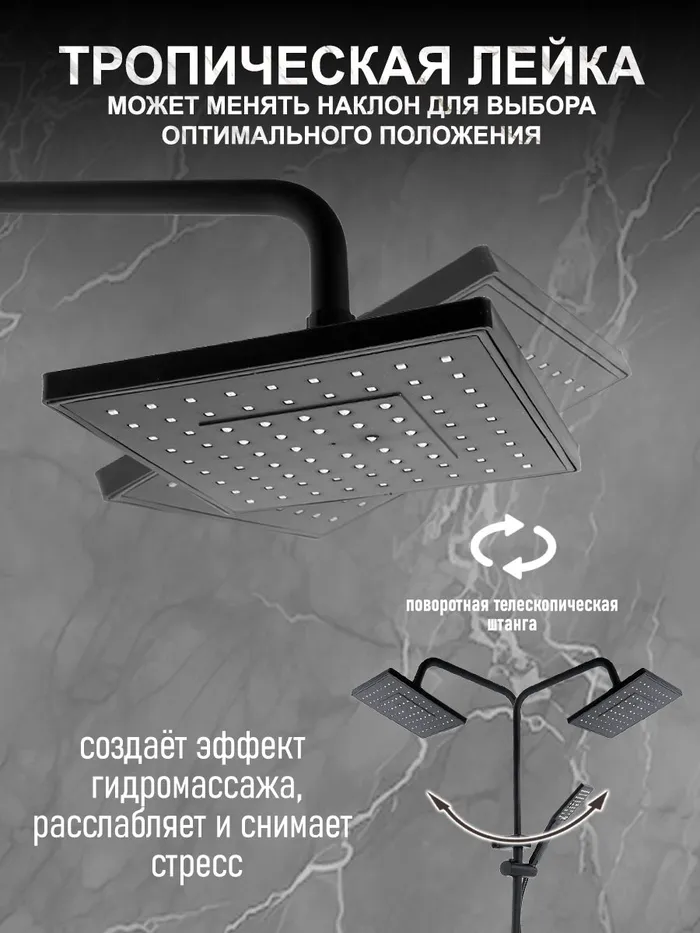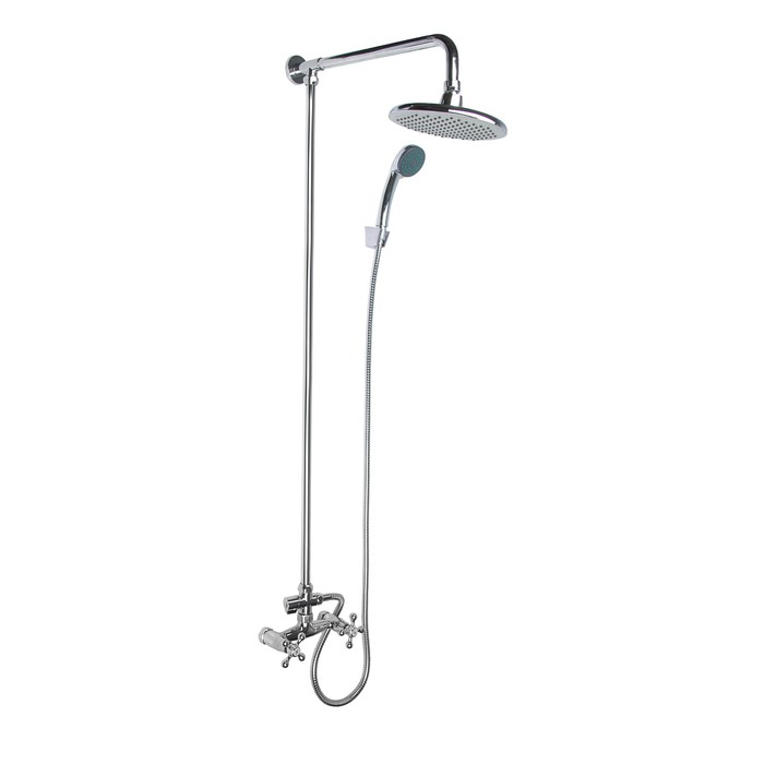 Конструкция фиксируется на стене. Модель оснащена смесителем с изливом, встроенным в корпус. На штанге расположен держатель для лейки со шлангом. Сверху находится тропическая лейка.