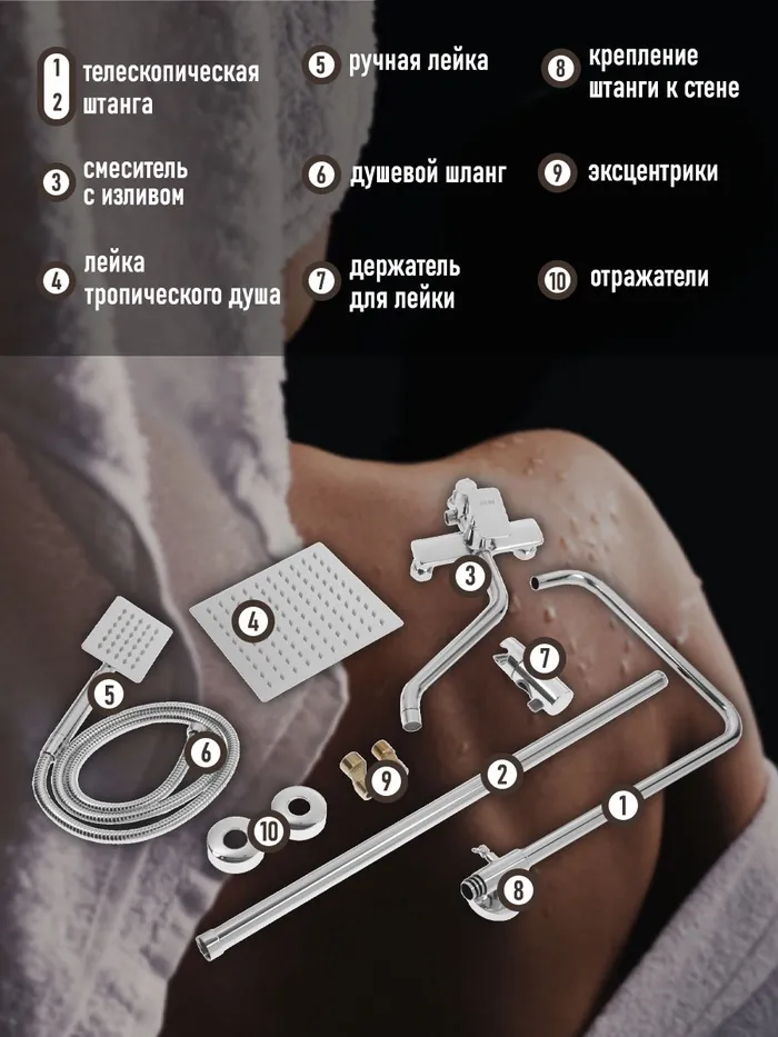Конструкция фиксируется на стене. Модель оснащена смесителем с изливом. На штанге расположен держатель для лейки со шлангом. Сверху находится тропическая лейка.